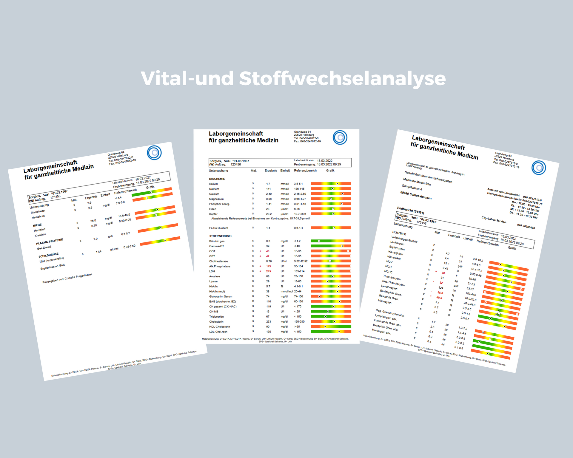 Vital- und Stoffwechselprofile, Hormon-, Leber-, Fett-, Eiweiß- und Kohlenhydratstoffwechsel, Mineralstoffe, Vitamine sowie spezielle Laboranalysen zur Entgiftung und individuellen Belastung.